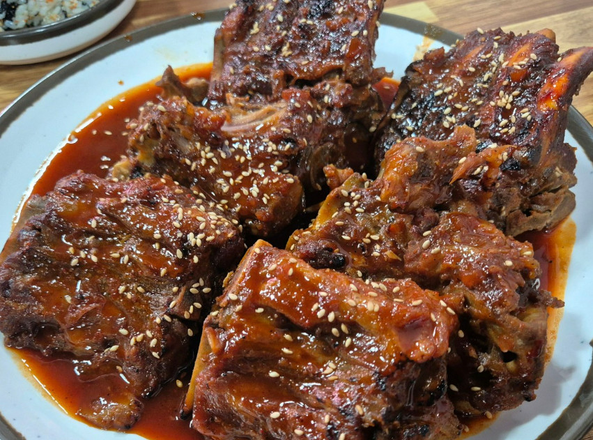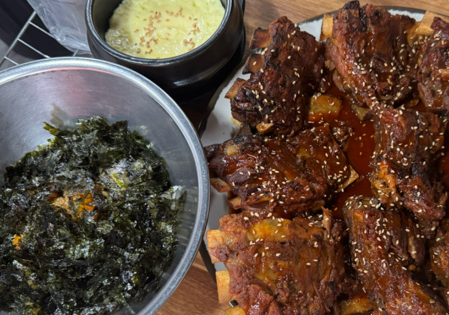 중간맛 뼈구이로 주문했는데 적당히 매콤해서 딱 좋았습니다. 양도 넉넉하고 주먹밥이랑 먹으니 금세 배불러요.