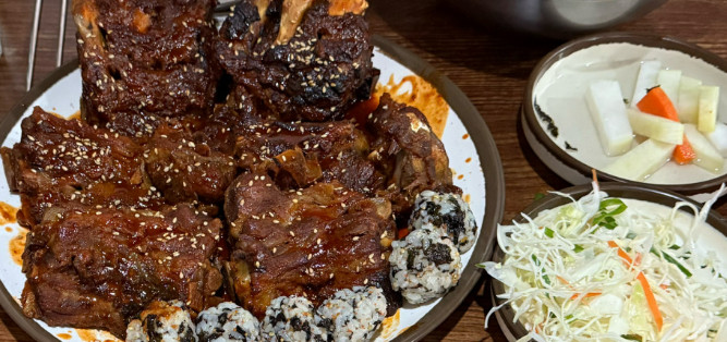 뼈구이 양념이 달콤하고 매콤해서 질리지 않고 계속 먹게 되네요. 날치알주먹밥도 담백하니 좋았어요.